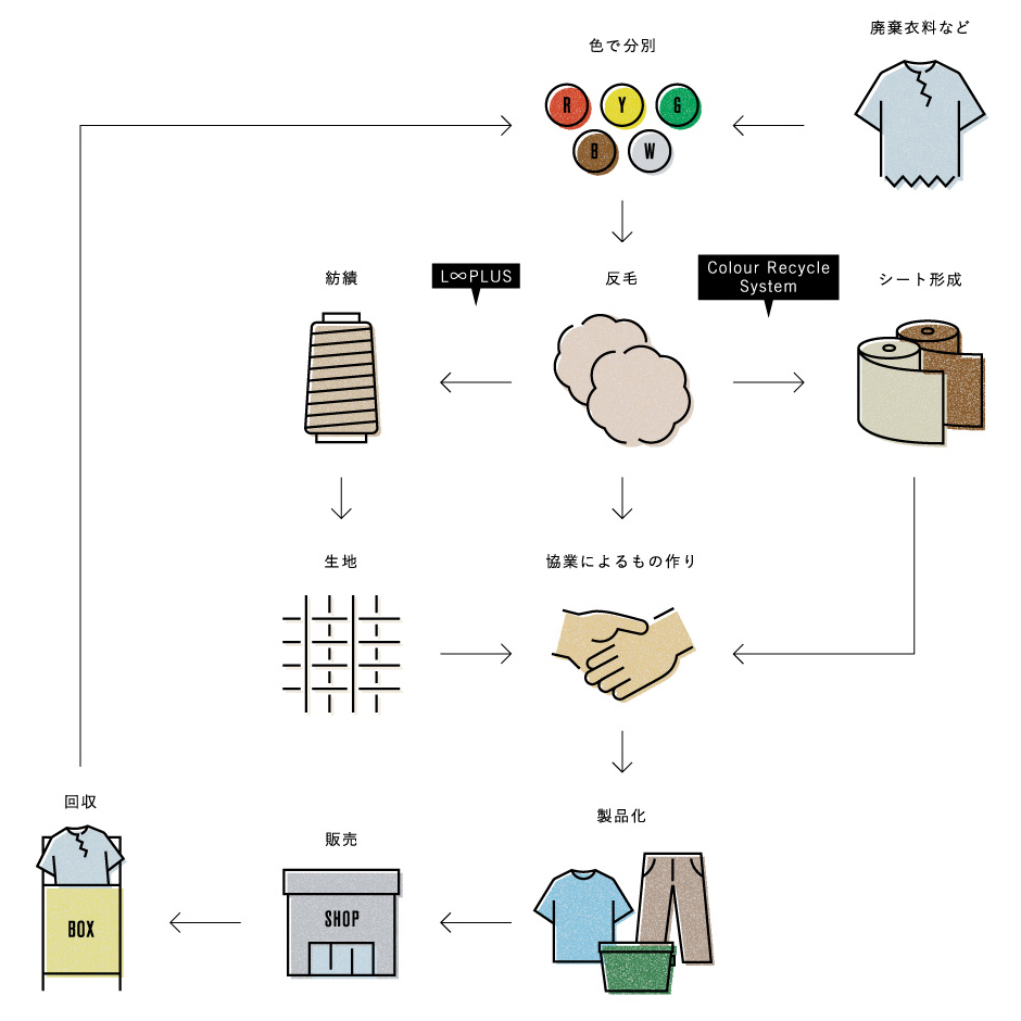 異なる素材(材質)が混在していて、素材分別が容易ではない衣料品のアップサイクル。当社は、素材分別が難しい廃棄繊維を色で分けて付加価値のある素材・製品にアップサイクルする Colour Recycle System の開発・研究を行っている「Colour Recycle Network (カラーリサイクルネットワーク)」との協働によって、新製品を開発しました。